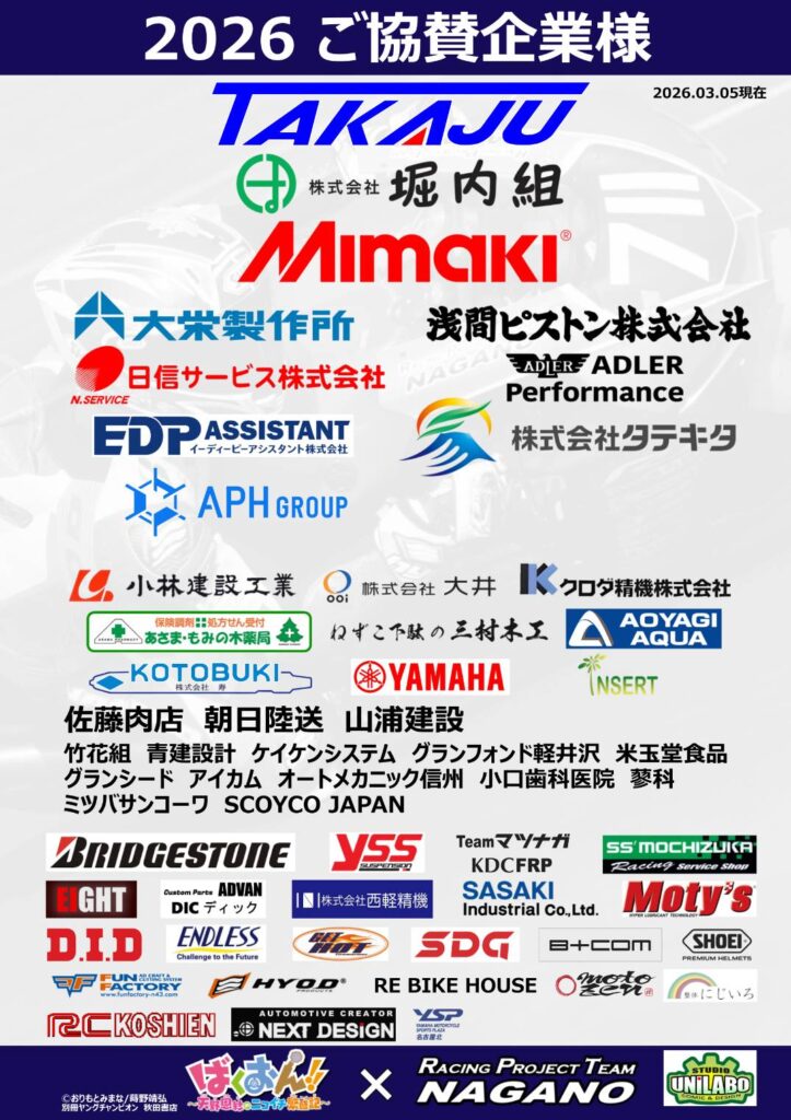 スライダーアイテムリンク 詳しくはこちら → スライダーアイテムリンク 詳しくはこちら → 新着情報 what’s new 【2026.05.02(日)10:00-16:00】2026 春の交通安全啓発活動!2輪4輪レース車両展示|イオンモール佐久平イベント企画 2026年4月1日 【春の交通安全フェスタatイオンモール佐久平】開催のお知らせ いつもRPT長野にご声援をいただきまして、誠にあ… 一覧を見る 2026年度ご協賛企業様 2026年度個人サポーター様 準備中 RPT長野3ミッション Team Mission 世界大会「鈴鹿8耐」参戦で長野をPR 世界中が注目する国内有数の集客を誇るスポーツイベント「鈴鹿8耐」へ長野県から挑戦! レース参戦を通じて、会場観客から世界メディアへ長野県の魅力をPRします。 詳細はこちら リングプロジェクト2輪4輪の輪を広げる レース活動を通じてモータースポーツファンや、ライダーに対し長野県の絶景ツーリングスポットや長野県の特産品を紹介し、長野県の魅力を伝えます! 詳細はこちら 地域活性化プロジェクト! 地域のイベントへも積極的に参加し、地元の方々と一体となった地域活性化プロジェクトを盛り上げます。 詳細はこちら お知らせ Infomation 【2026.05.02(日)10:00-16:00】2026 春の交通安全啓発活動!2輪4輪レース車両展示|イオンモール佐久平イベント企画2026年4月1日 【2025.11.7(金) -9(日)】2025 MFJ公認 準国際競技会 サンデーロードレース 第4戦(最終戦)2025年12月7日 2025鈴鹿8耐レースレポート2025年8月13日 鈴鹿8耐のレース結果の掲載2025年8月10日 「ばくおん!! ~天野恩紗のニコイチ繁盛記~」とコラボのお知らせ RPT NAGANO Announces Collaboration With BAKUON!!:Onsa’s Bike Shop Life2025年7月5日